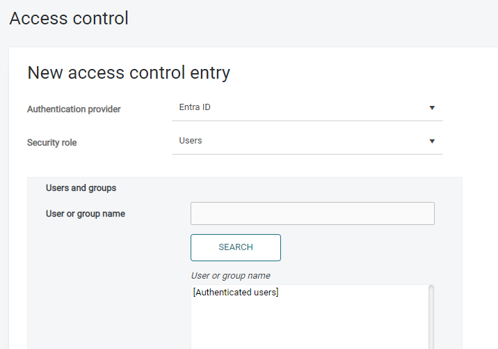 Select your newly created authentication provider and click SEARCH. Then, the default group Authenticated Users and the Entra groups are visible. You can use all these groups in access controls to enable permissions for authenticated users.