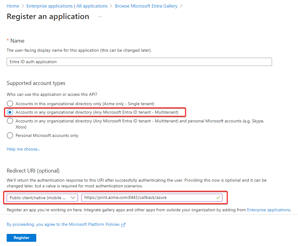 In Supported account types, select Accounts in any organizational directory (Any Microsoft Entra ID tenant – Multitenant).