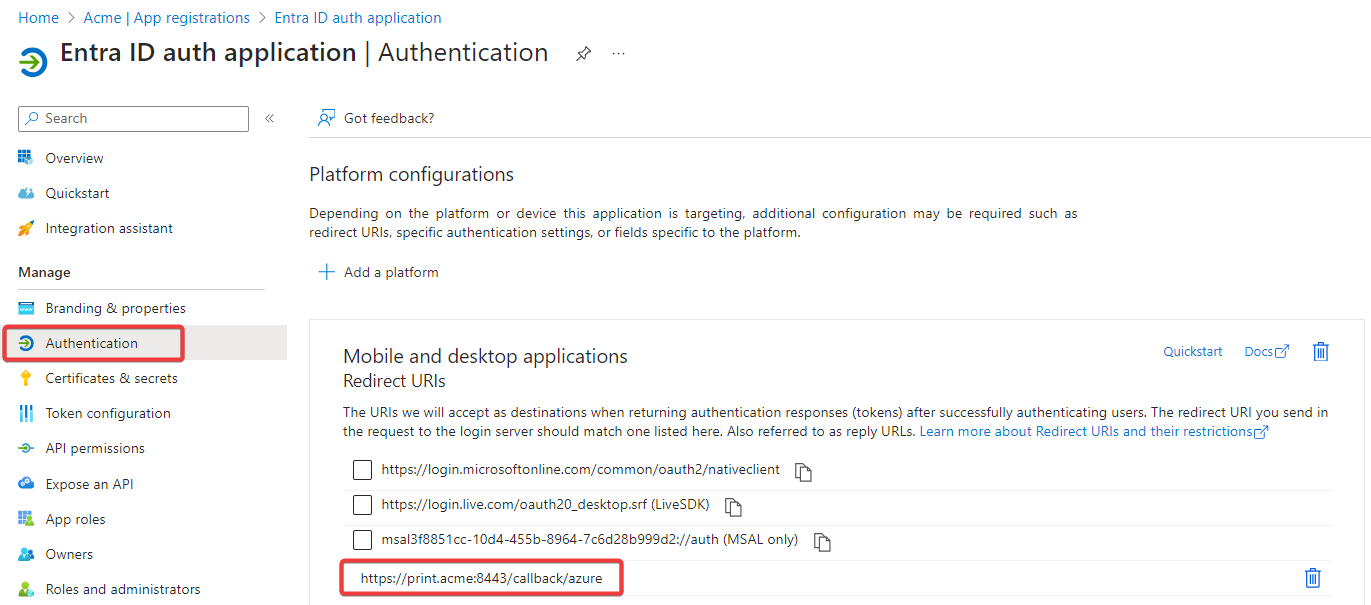 In the Callback domain for custom application drop-down menu, select the domain that matches the one from the Redirect URIs that is already added in Azure application. The pre-selected value represents the domain from the SAFEQ Cloud Web URL. For adding or updating the Entra Redirect URIs, go back to the Entra ID homepage in Azure portal and click App registrations. Click your application and then click Authentication.