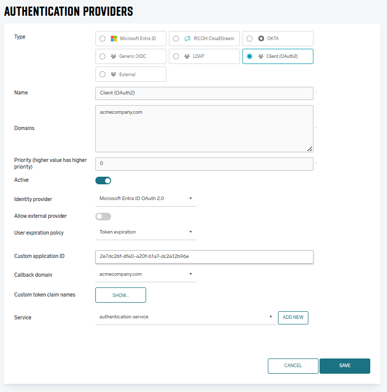 . The domain and the port should be the same as the ones of the SAFEQ Cloud website URL. For example, if the SAFEQ Cloud web URL ishttps://print.acme.com:8443,