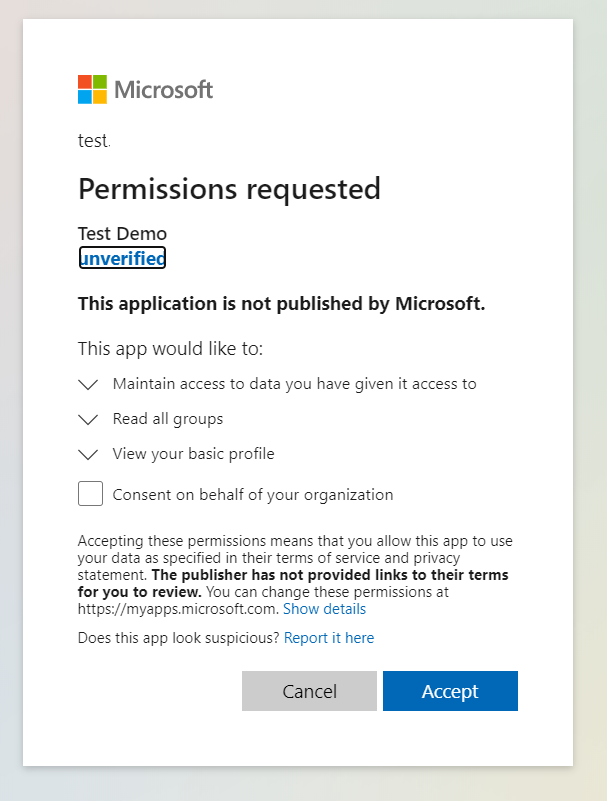 When the users accept the permissions, the sync groups operation is done. If you perform the synchronization for the same account/application again, the users will not be required to grant permissions again.
