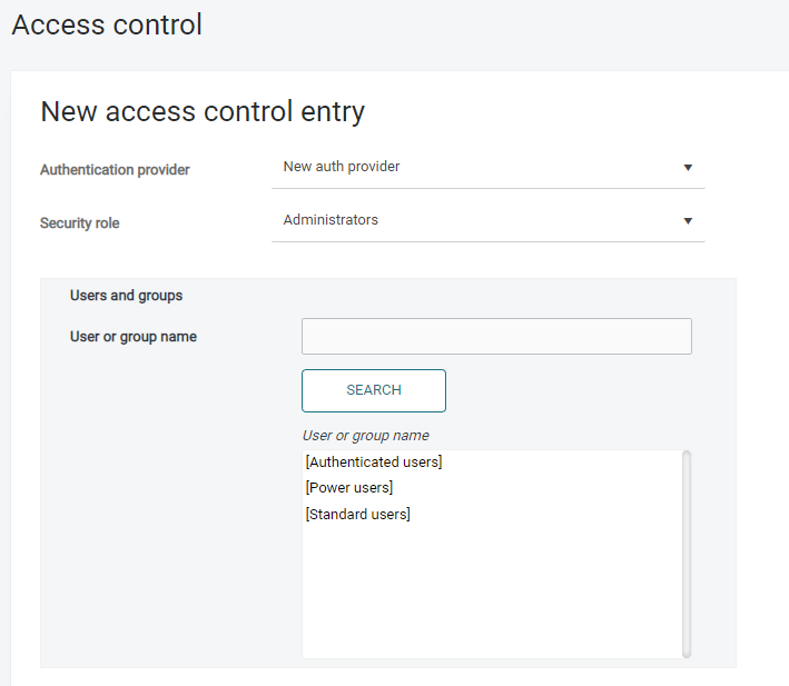 The default group Authenticated Users will become visible. You can use this groups and individual users in access controls to enable permissions for authenticated users