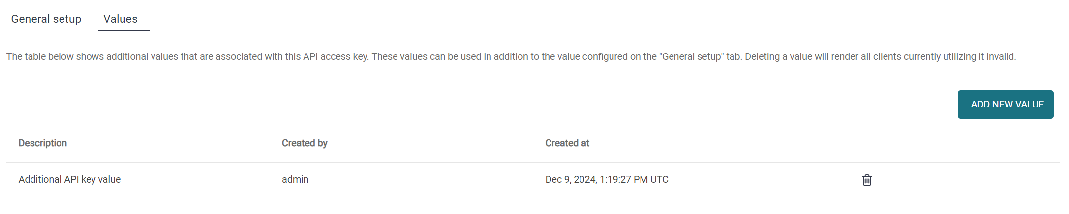 After you have created and saved your new API key, click the edit icon to edit it. Go to the Values tab and then click Add new value.