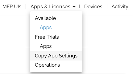 The Copy App Settings page appears displaying the following panels:Select App - Lists the apps for which the Copy App Settings feature is available.