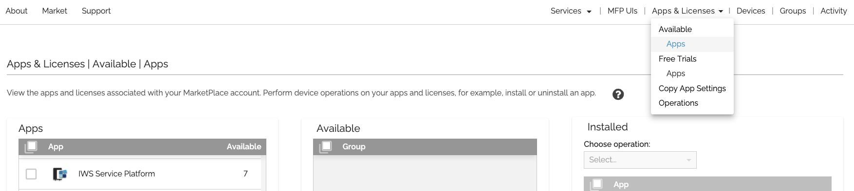 Click on Apps & Licenses on the MarketPlace menu bar. The Apps & Licenses drop-down menu appears.