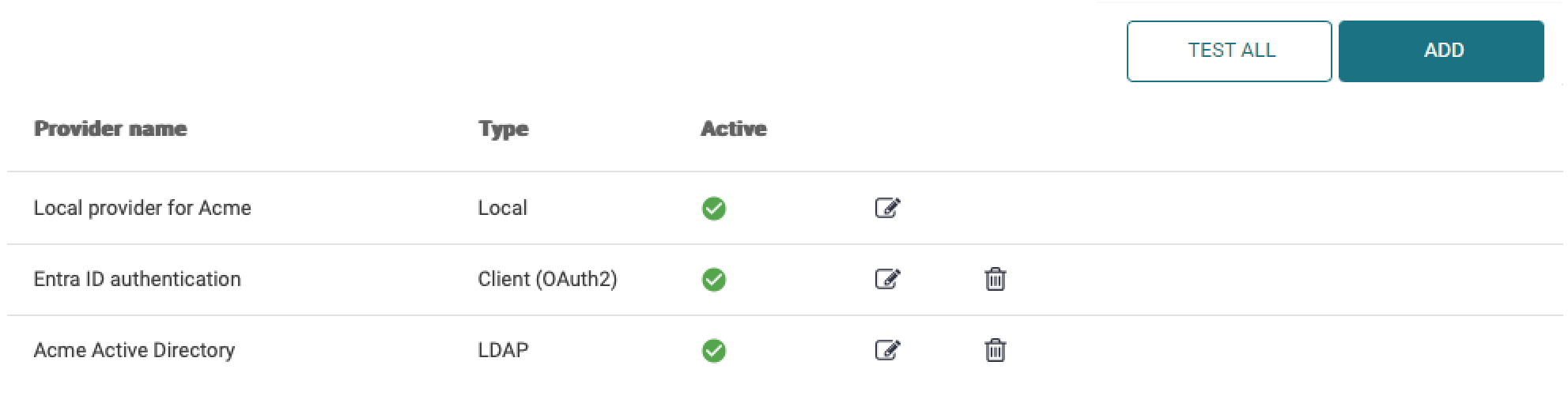 Warning: In a production environment where numerous users are enrolled in the system, deleting an Authentication Provider will result in users' information not being available anymore for authentication, retrieving card numbers, PINs, etc., as user records are bound to the Authentication provider ID that was used when adding them to the database.