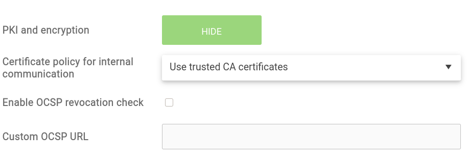 The Certificate policy for internal communication option should be set to Use trusted CA certificates, as shown on the above picture.