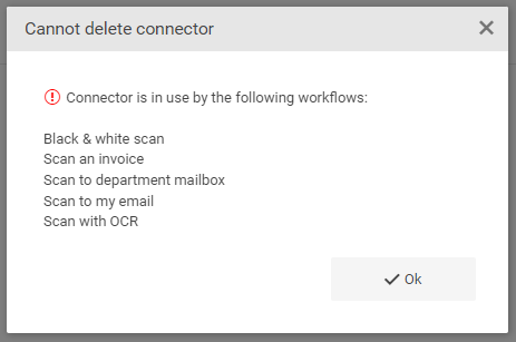 You cannot delete a connector that is used by one or more workflows. You will see an error message. The message displays a maximum of 10 workflows.