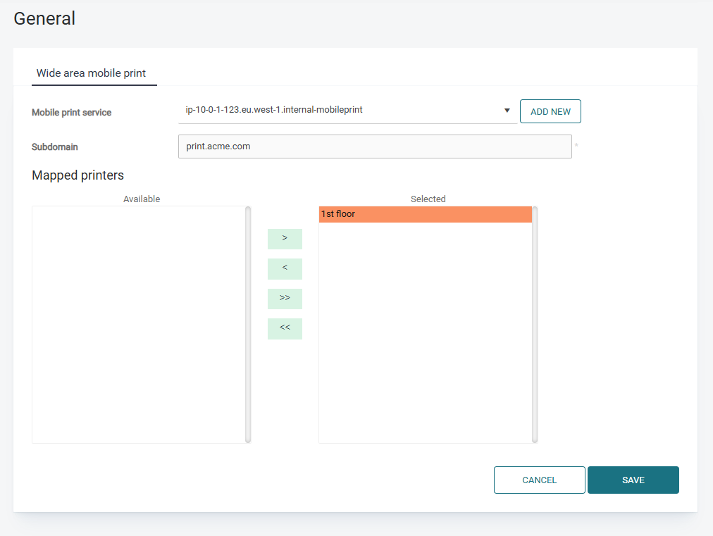 Go to the Settings > General Settings, tab Wide area mobile print tab and click Add.