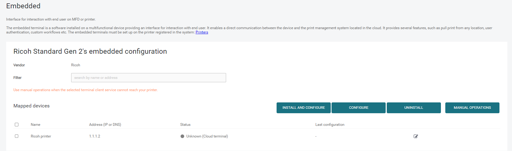 Before you can install a terminal on an MFD, you must create a configuration for it. This is done in the Printers > Embedded terminal templates section of SAFEQ Cloud Web UI. You can have any number of configurations, for example, one configuration for MFDs at one site, and another configuration for MFDs of the same brand at another site.