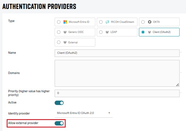 External authentication must be allowed in each provider where the users will be logging via external authentication. External authentication is only supported for authentication providers where Type is Client. To allow external authentication in your client provider, click Show advanced options, and then select Allow external provider.