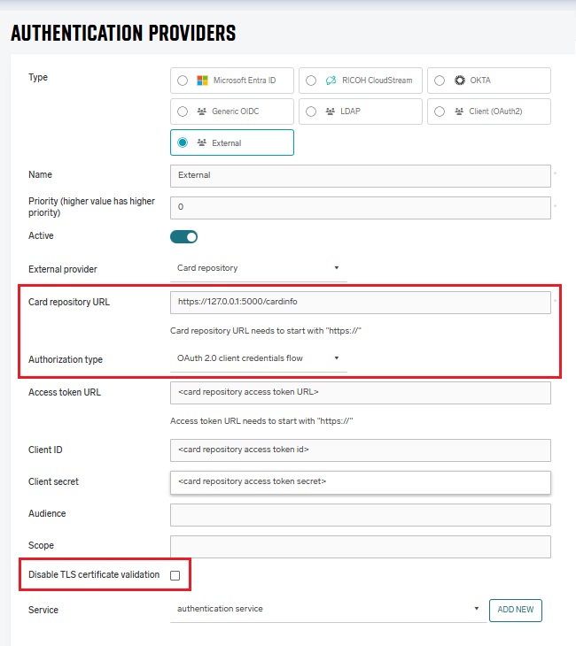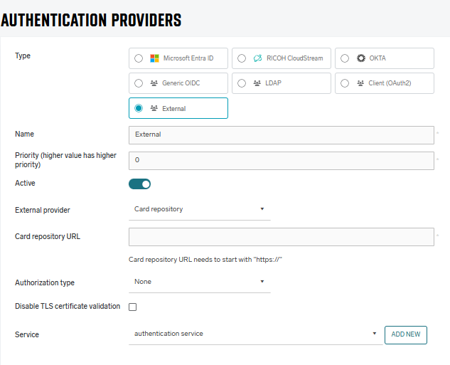 Authorization type – the authorization that is used for securing the ECR. Currently, SAFEQ Cloud supports only ECR that is secured using OAuth 2.0 Client Credentials Flow or not secured: