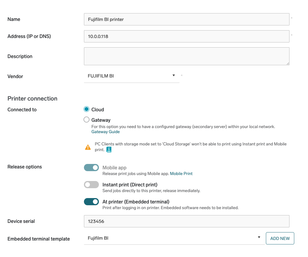 Adding FUJIFILM BI printer and Embedded configuration in SAFEQ Cloud Web UI