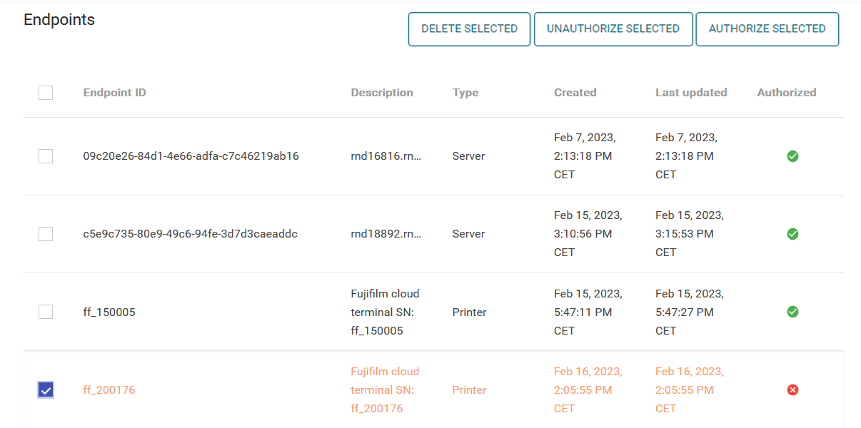 In SAFEQ Cloud web UI, go to Security > Endpoints and find the entry with ID number that you noted in the previous step. Select the entry and click Authorize selected.