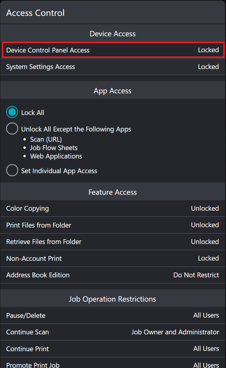 If you wish to define access to individual functions separately, set App Access instead of Device Control Panel Access.