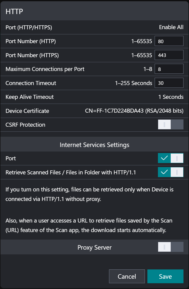 Check that Port (HTTP/HTTPS) is set to Enable All. You can also set it to Enable HTTPS Only, which disables the HTTP port.