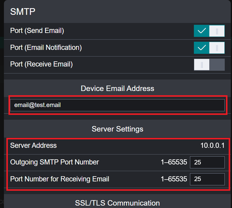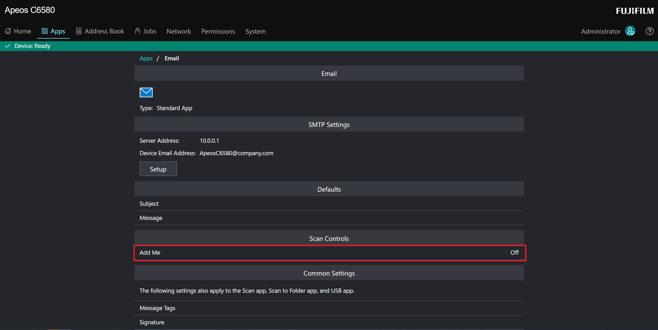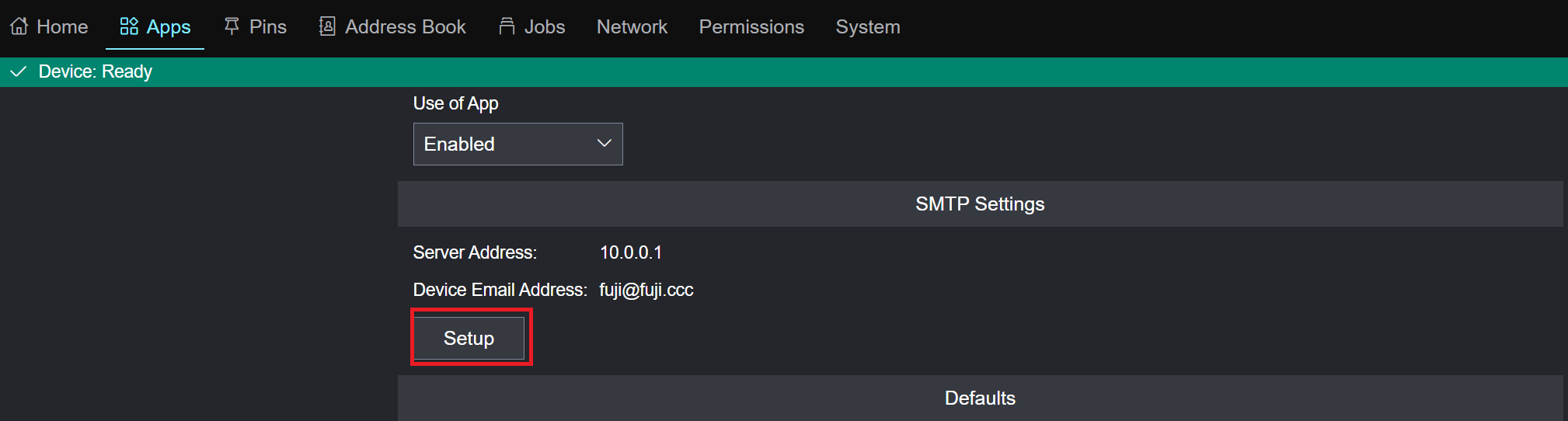 Enter the IP address of the MFD in your web browser to access the MFD's web interface and log in as administrator. Configure the following: