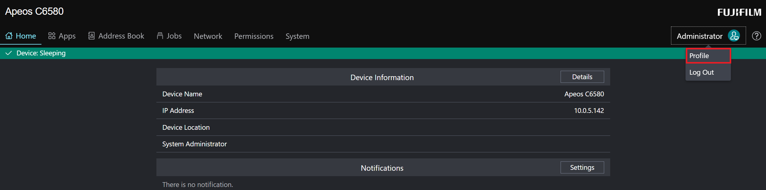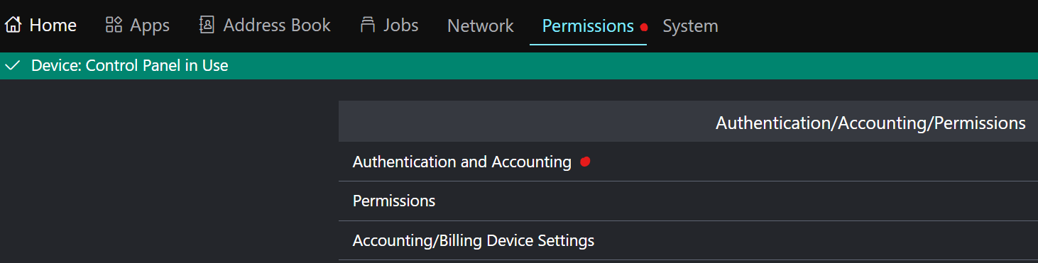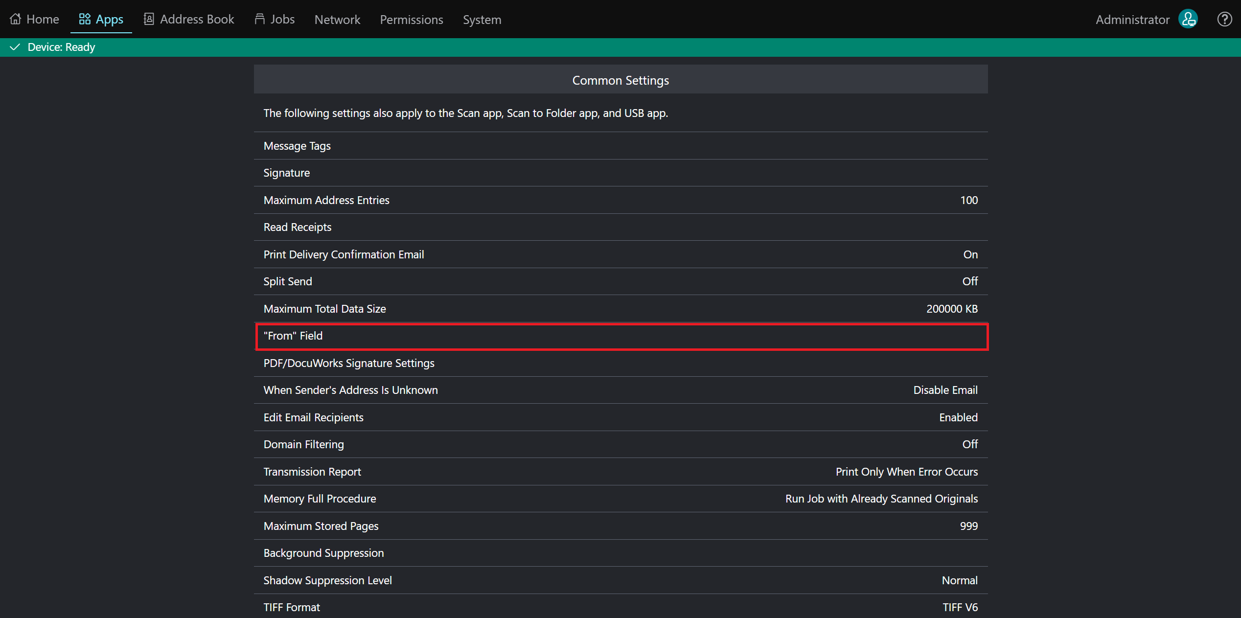 On the MFD panel, log in to MFD as a system administrator and go to the Device settings.