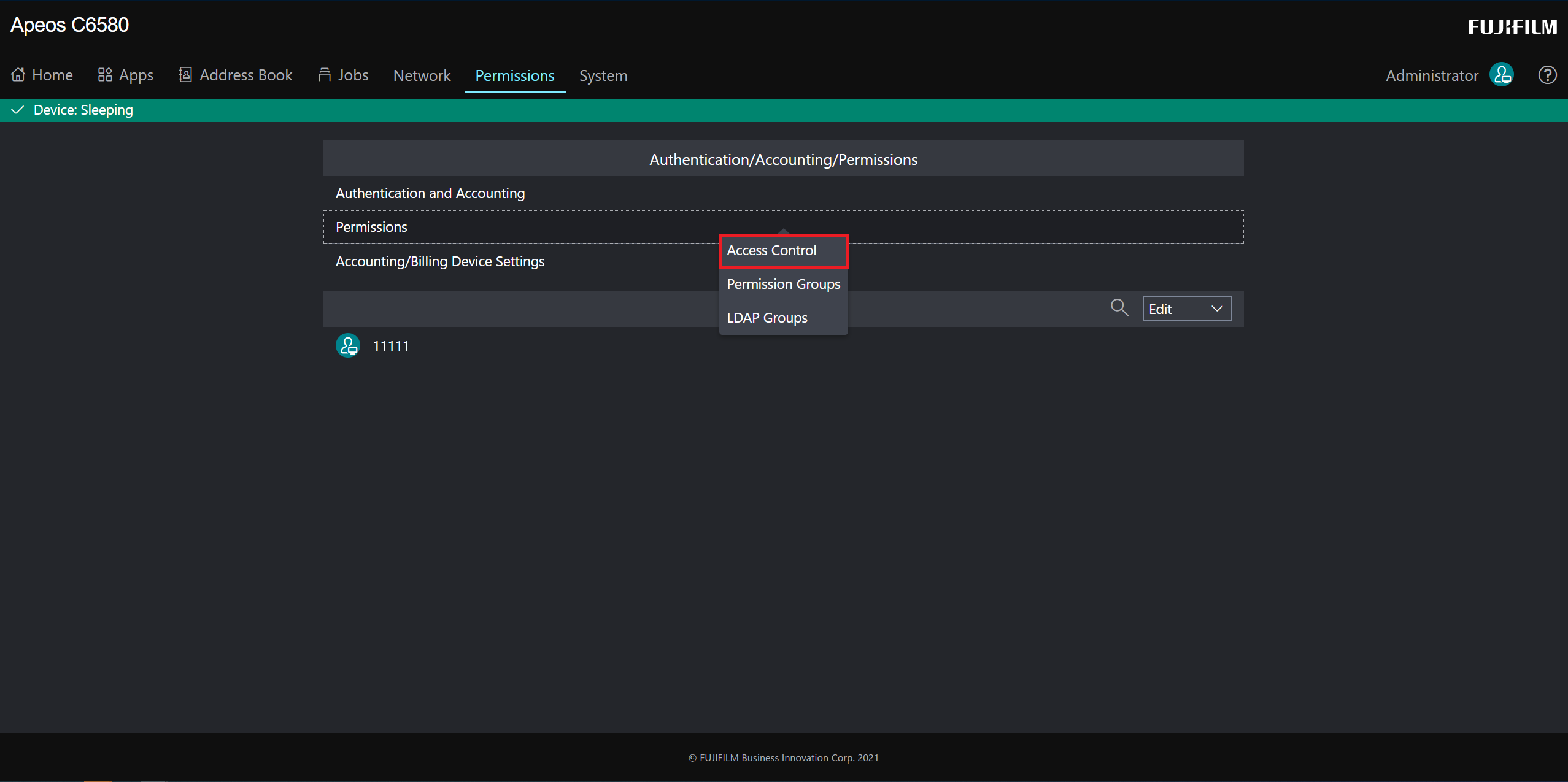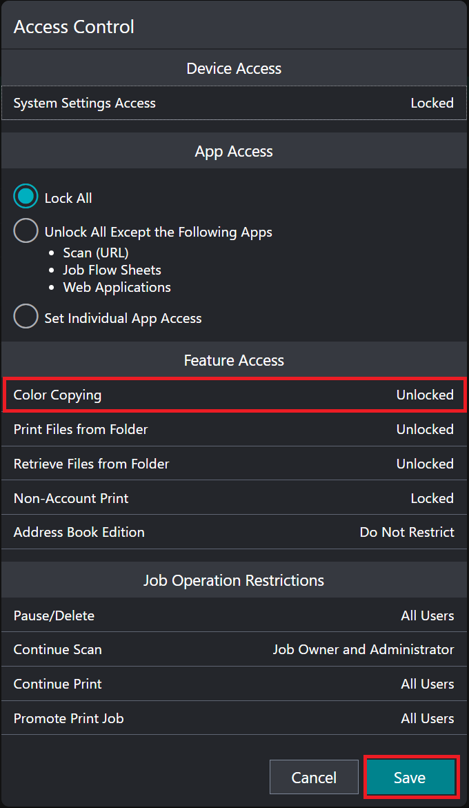 For the terminal to restrict access to Full-color copy by user access right setting, configure the Access Control in the following way: