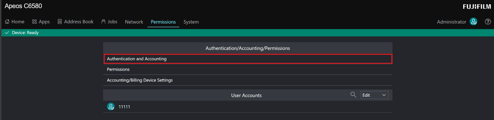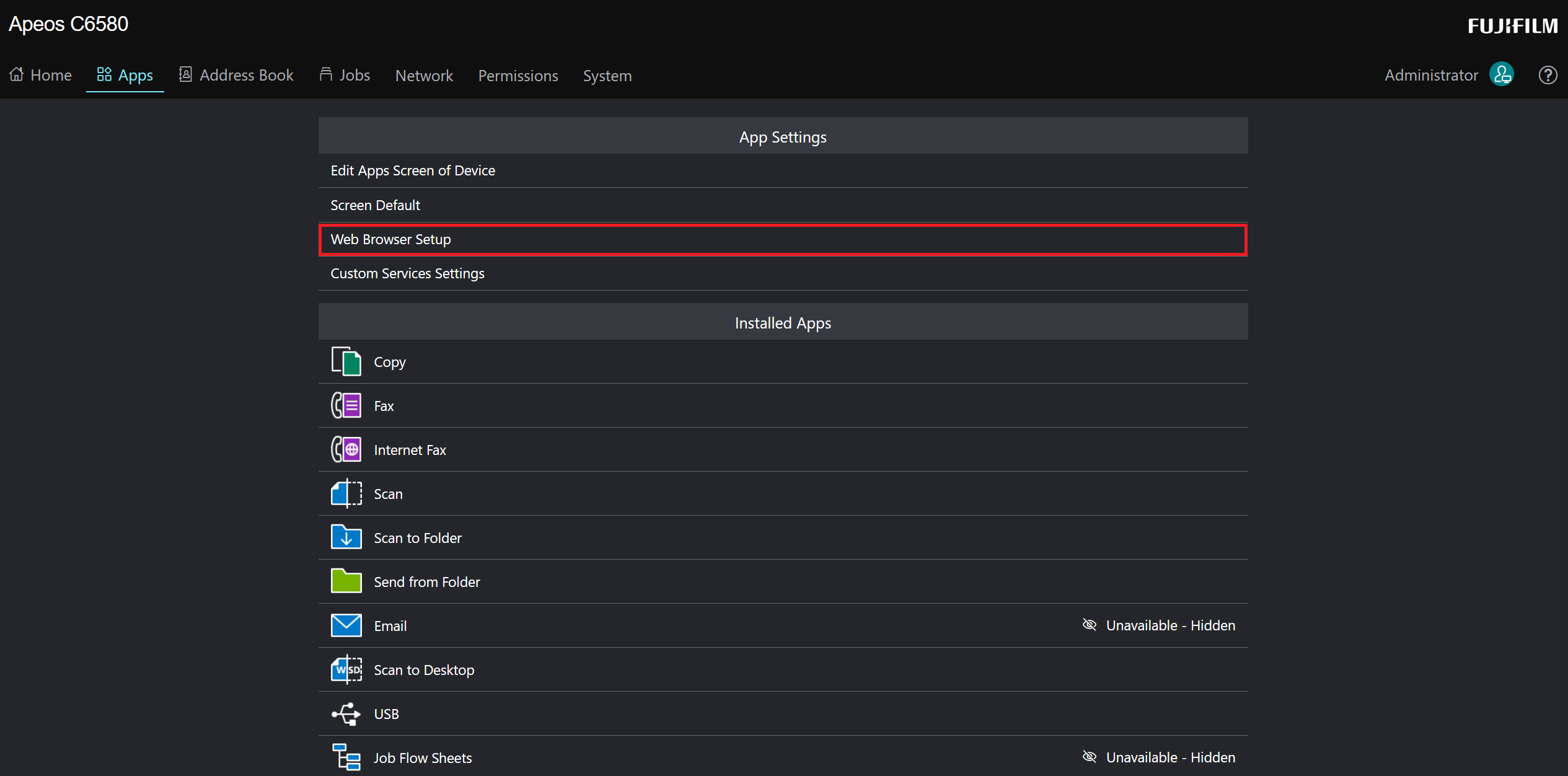 Go to Apps > App Settings > Web Browser Setup. In case of ApeosPort devices, go to Permissions > Authentication > Advanced Settings.