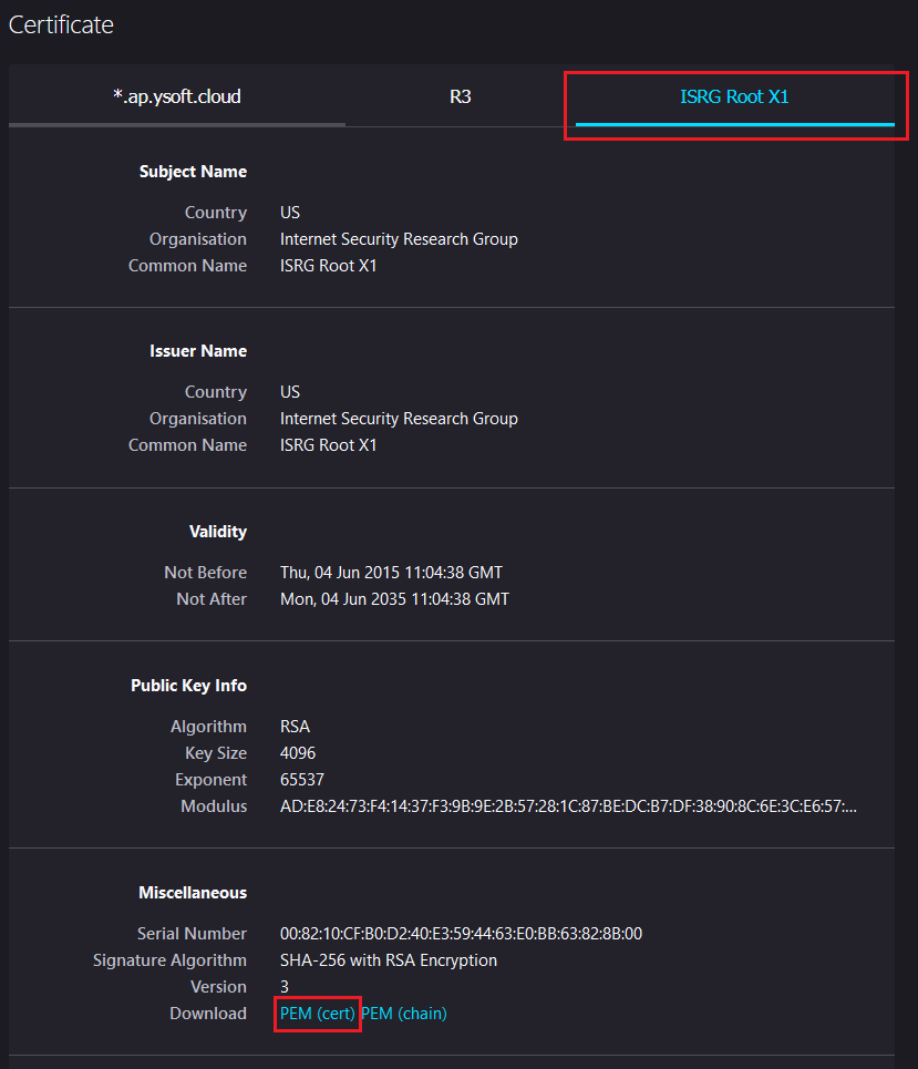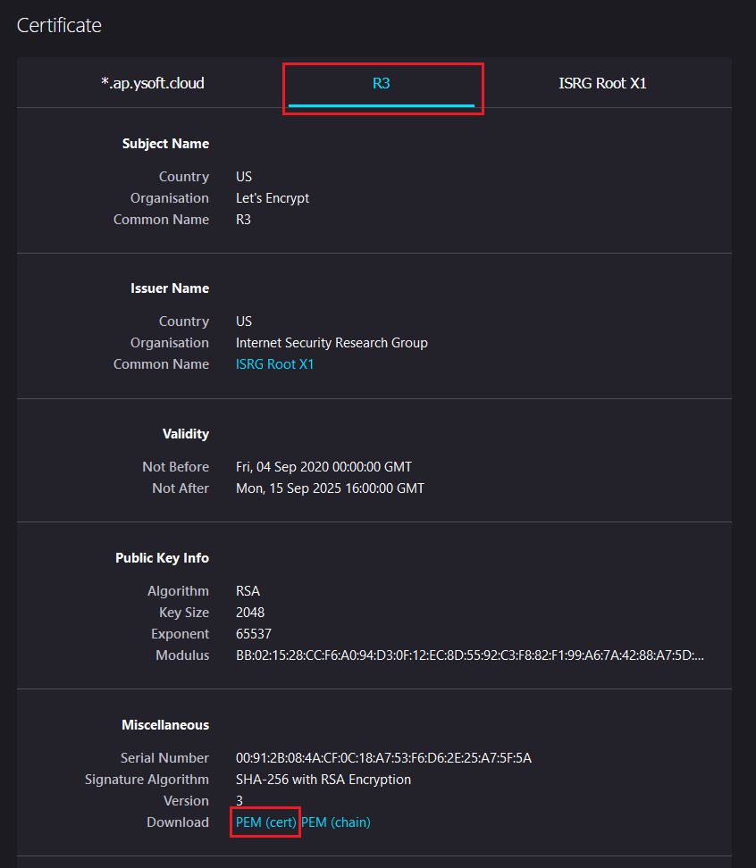 In the new window, navigate to both tabs marked below and download the certificate in PEM format.