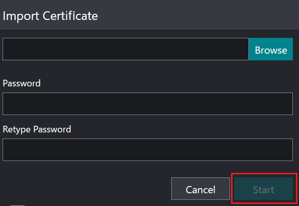 Find the obtained Certificate Authority in PEM format, fill in the admin password, and click Start.