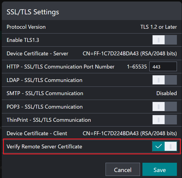 Make sure that Verify Remote Server Certificate is disabled. Otherwise, users would get an error message when opening the SAFEQ Cloud application on the MFD panel due to an untrusted certificate.