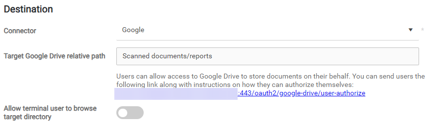 In the Target Google Drive relative path, enter the folder where the workflow delivers scanned files, relative to the root of the user's drive. For example, Scanned documents/reports. If the folder doesn't exist, the connector will create it.