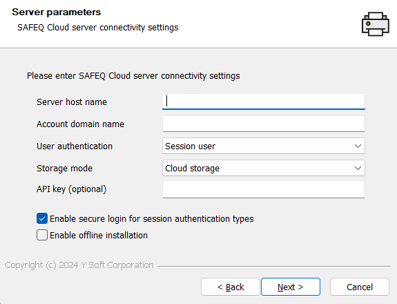 Server host name – address or host name of the SAFEQ Cloud server to connect to. For “Local storage mode” the address should be the account DNS of the SAFEQ Cloud primary server, usually the same as Account domain name.