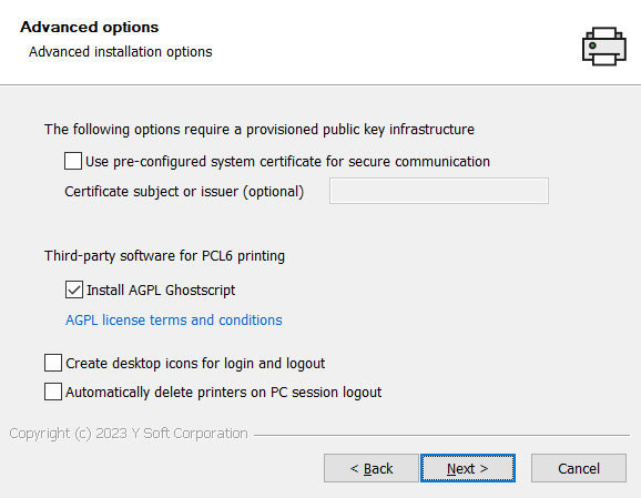 – Accept the AGPL license and install Ghostscript software which is needed for PCL6 printing. The default value isfalse