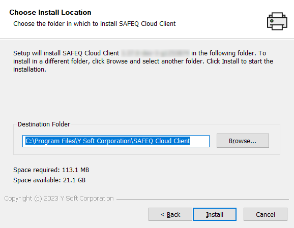 - /D=fullpath– install the application to an alternate path (e.g.- /D=d:\SAFEQ Cloud). The default is- C:\Program Files\Y Soft Corporation\SAFEQ Cloud Client