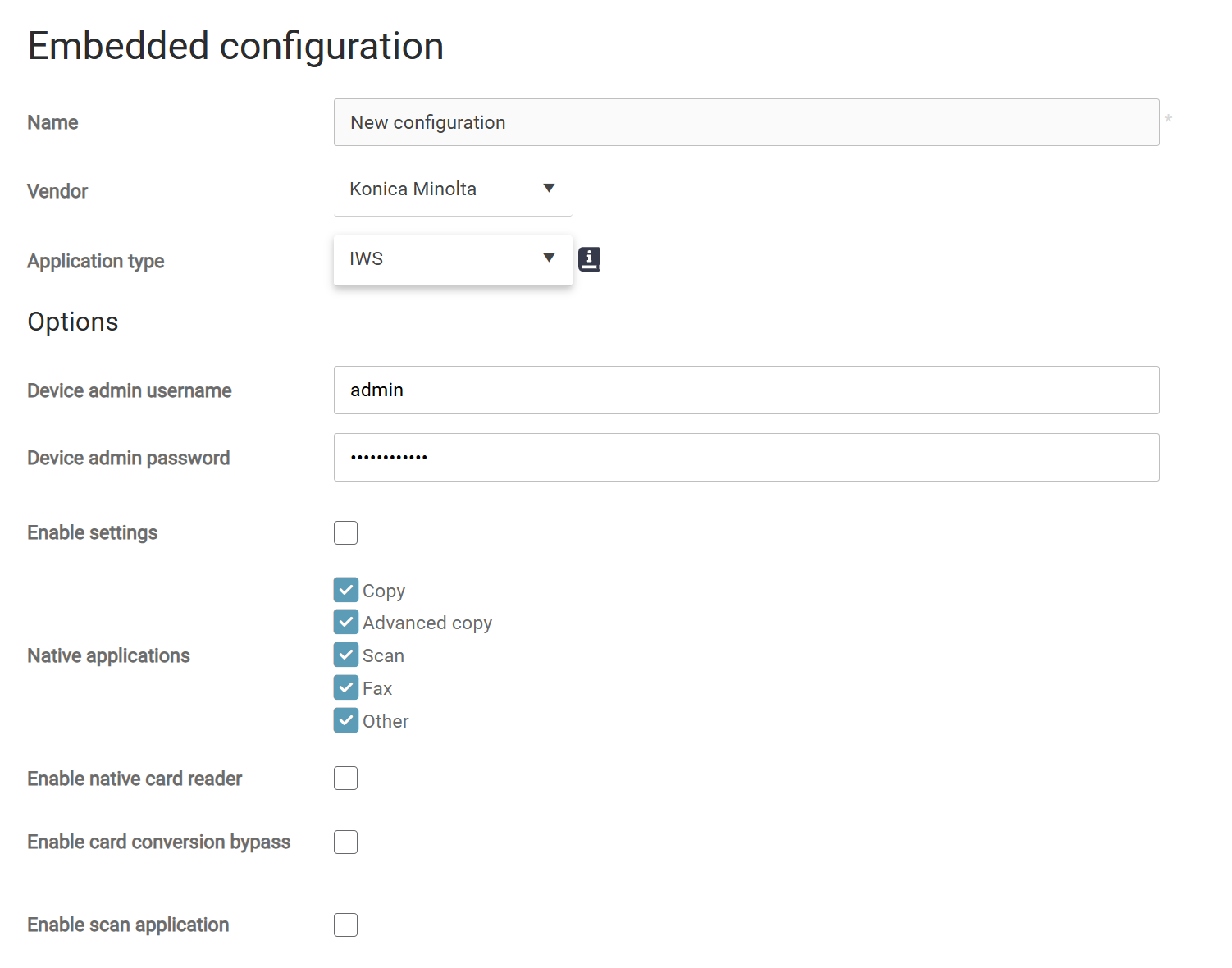 The native applications (Advanced Copy, Scan, Fax, Other Installed Applications) can be enabled/disabled from the embedded configuration.