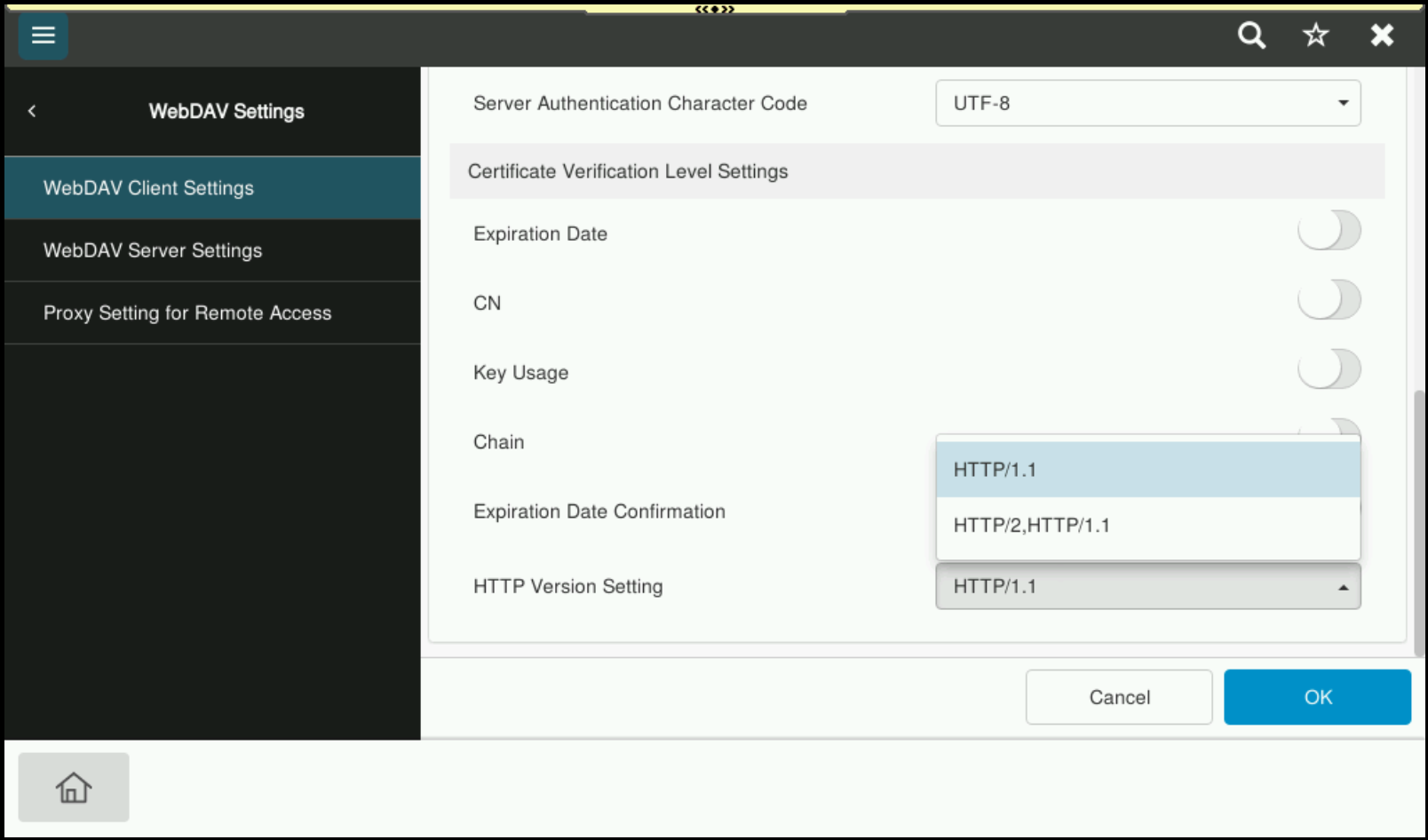 When you tap Test connection or when you attempt to save the configuration, the following window may appear on older MFDs that do not recognize the Let's Encrypt certification authority. Tap Certificate Registration to save the server certificate in the MFD.
