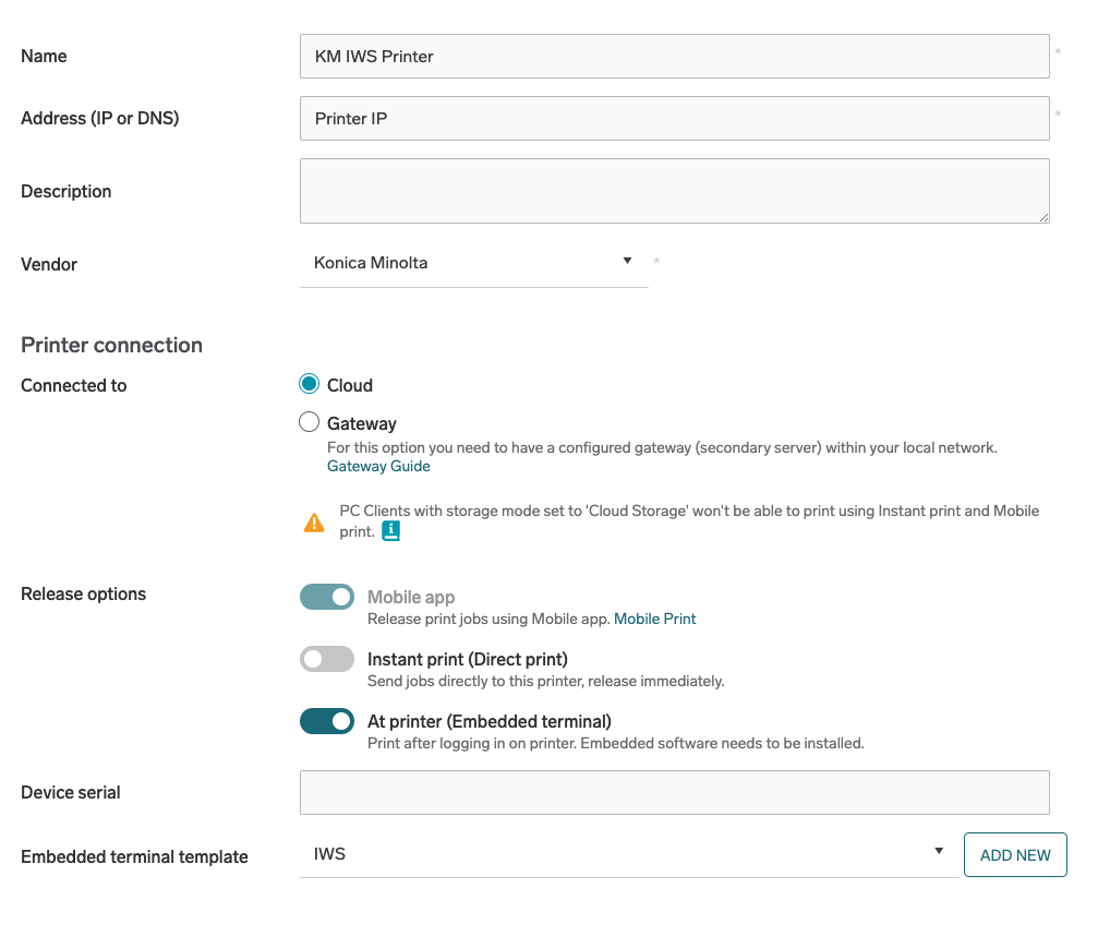 These steps are optional and if not performed, the Konica Minolta printer will be added automatically after the endpoint is authorised, see Registering the Cloud Terminal in the SAFEQ Cloud Web UI section of this page.