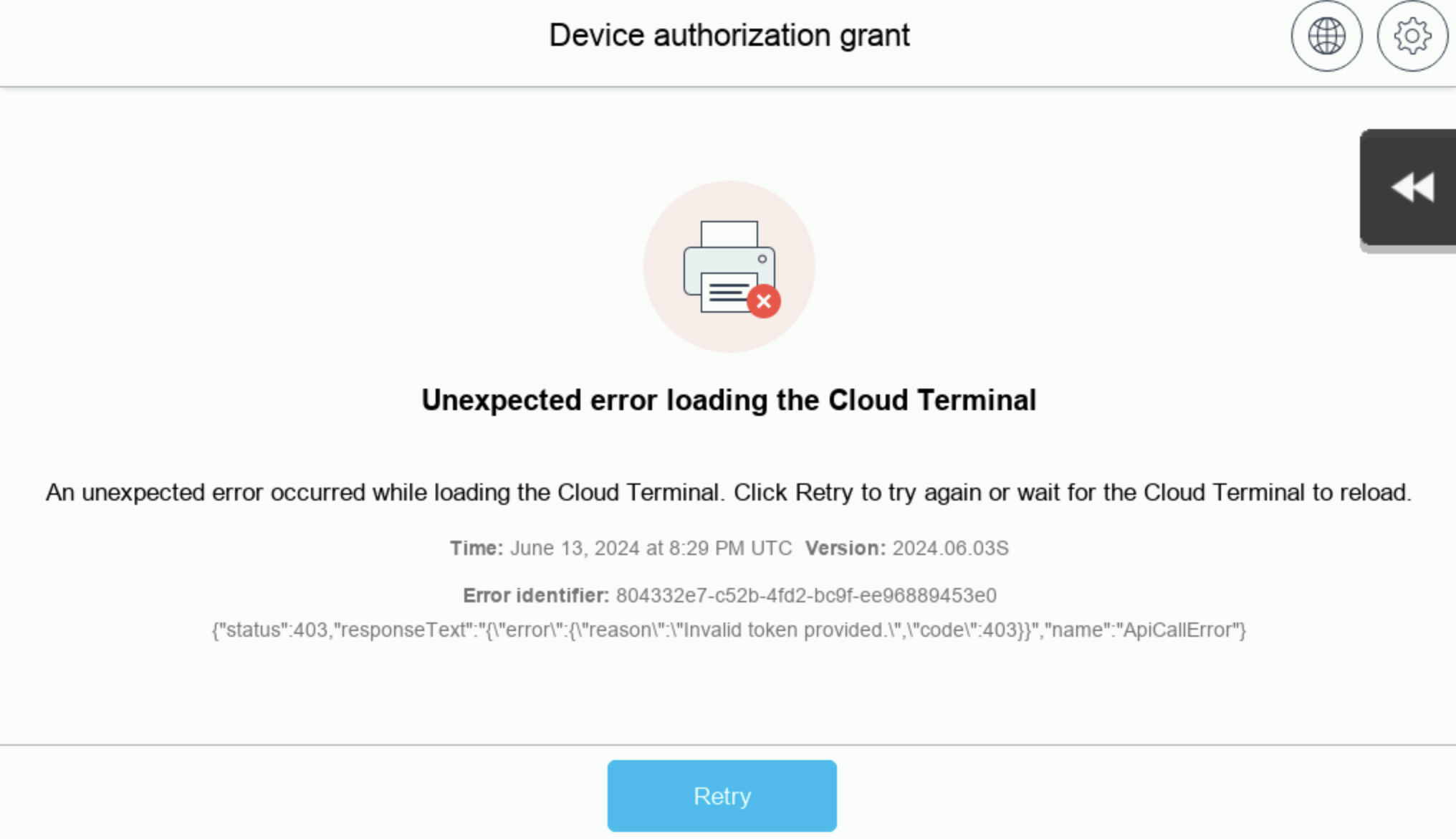 The 2024.06.02 terminal version supports port switching on server port 443. This change has introduced a limitation to the terminal when switching from the SAFEQ Cloud primary server to the SAFEQ Cloud secondary server. In this situation, an error may occur, accompanied by an error message that mentions "invalid token provided" in the details. To resolve this, you must reinstall the terminal.