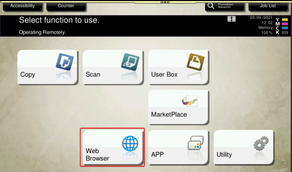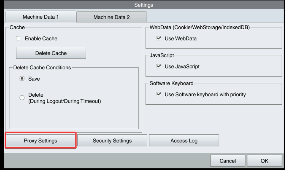 If your MFD needs to access the public Internet via a dedicated (non-local) gateway, such as a VPN with a proxy server, you must perform the following steps in the MFD settings of the browser.