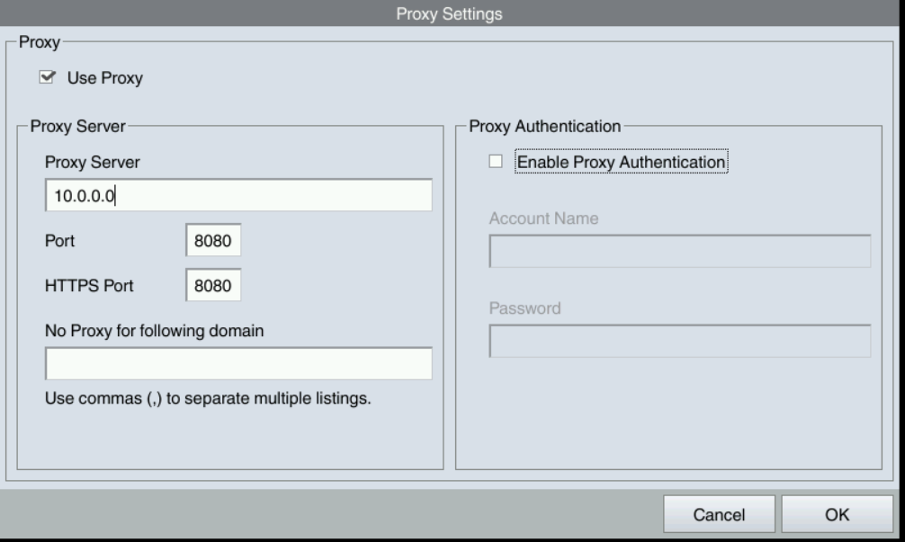 If the Proxy server needs authentication, check also Enable Proxy Authentication checkbox and fill Account Name and Password in Proxy Authentication settings.
