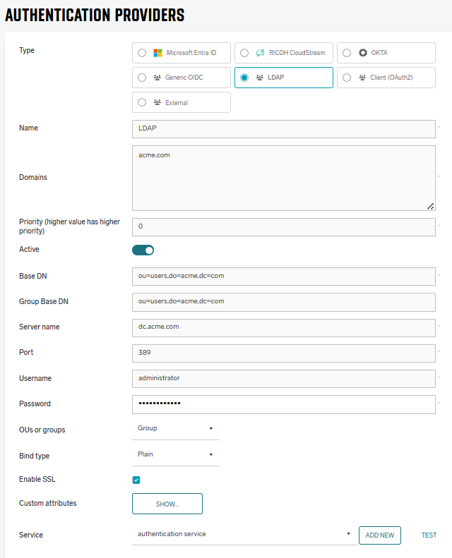 Service – Which Authentication Service will communicate to this LDAP server. If no service is created, it can be added using the Add button.