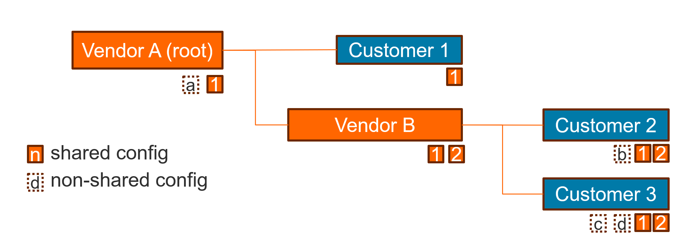For example, in the diagram below, a new customer under Vendor A will use Configuration 1 as the default, and a new customer under Vendor B will use Configuration 2 as the default.