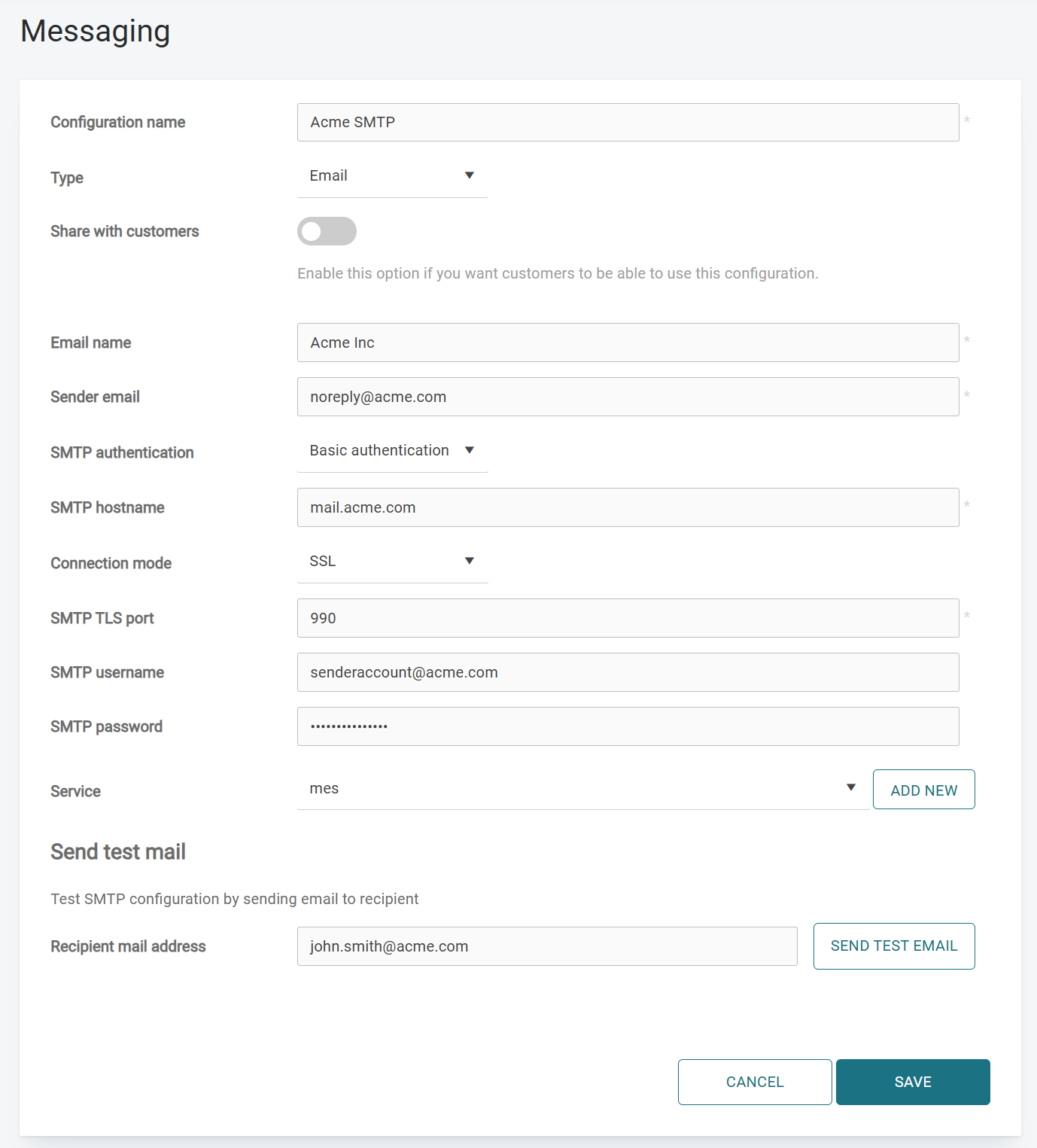 Enter the mail servers SMTP settings for outgoing email, including choosing relevant ports and security protocols as needed for the SMTP mail server. Any email service can be used, as long as it supports standard SMTP protocols, including Office365, Google Gmail, Exchange, etc. If a configuration is created or edited by the vendor, you can choose whether it should be shared with customers.