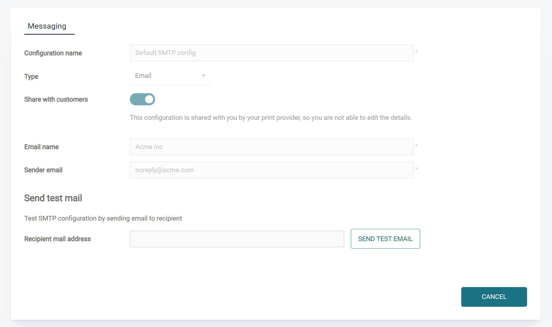 Customers cannot edit or delete shared configuration details. Customers can only view sender details and use test mail functionality of shared configuration.