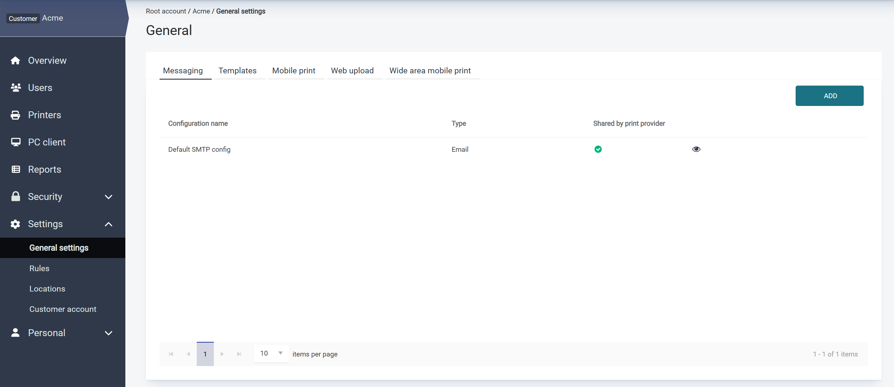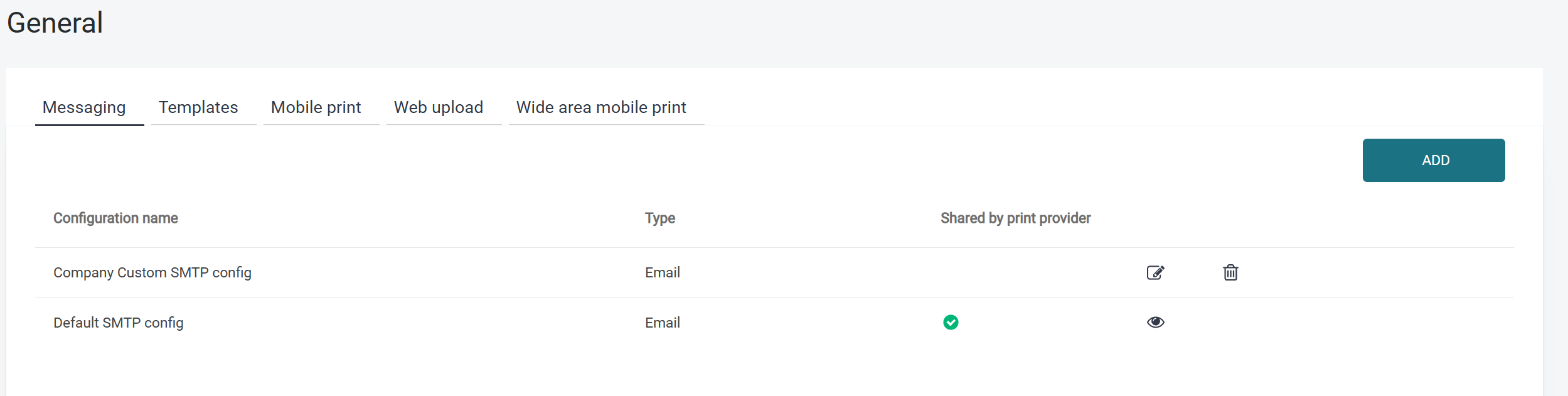 A messaging configuration is added for each delivery mechanism, such as an email SMTP delivery. Furthermore, a messaging configuration is required for any SAFEQ Cloud feature that uses email.