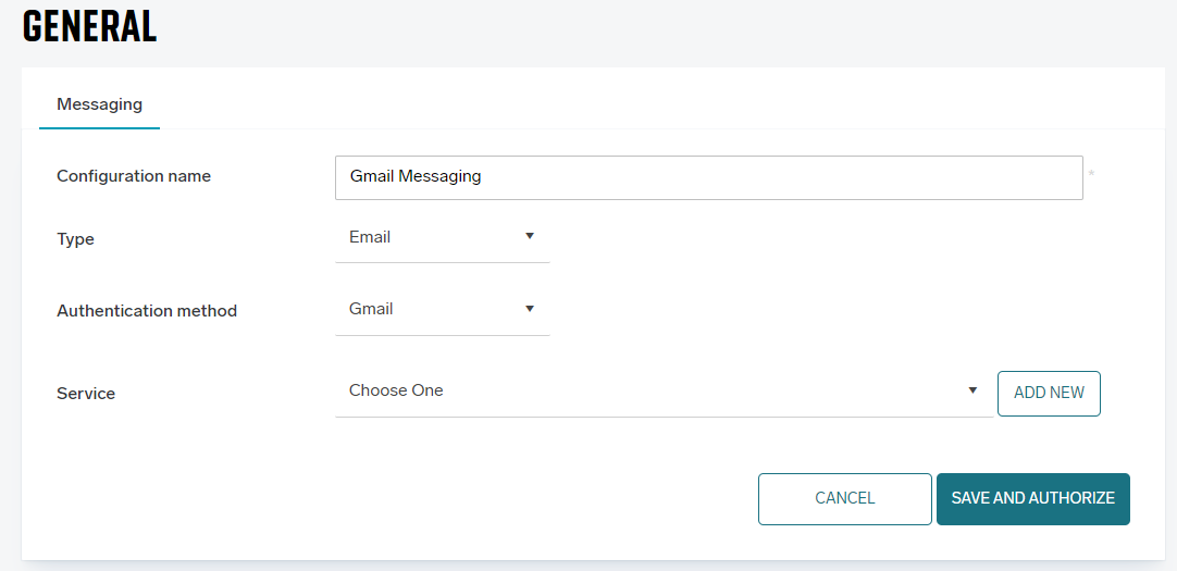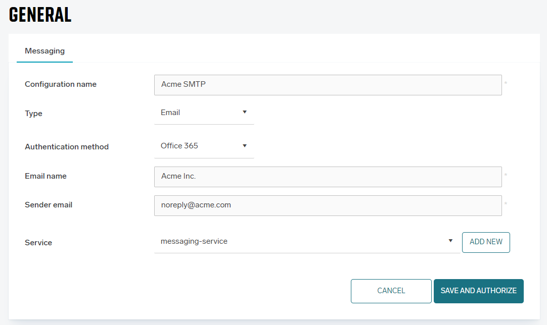 Select the Messaging service from the drop-down list that will send the email using the SMTP configuration. If no service is already created, you can add it by clicking Add.
