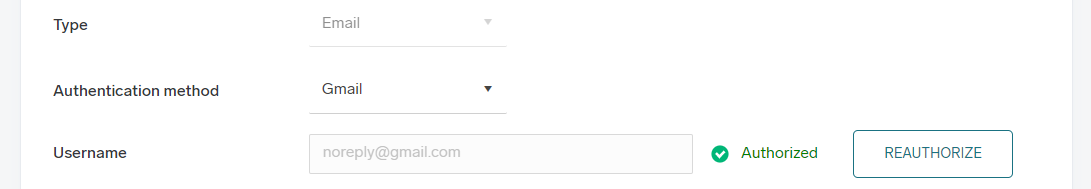 Gmail is one of the available authentication options under the authentication method dropdown. It uses OAuth 2.0 as the authorization protocol, and during authorization, you will be redirected to the Google authorization flow (when saving a new Gmail messaging configuration or after pressing the Authorize/Reauthorize button when editing an already created Gmail configuration).