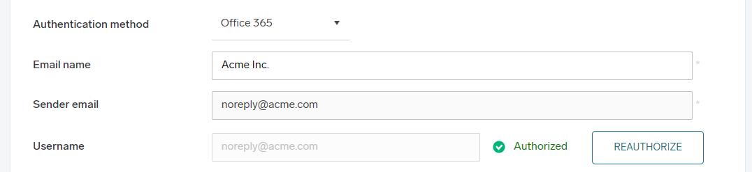 Office365 is one of the available authentication options under the authentication method dropdown. It uses OAuth 2.0 as the authorization protocol, and during authorization, you will be redirected to the Microsoft authorization flow (when saving a new Office365 messaging configuration or after pressing the Authorize/Reauthorize button when editing an already created Office365 configuration).