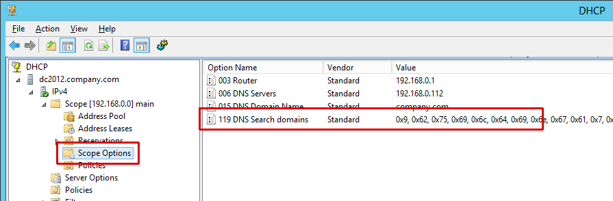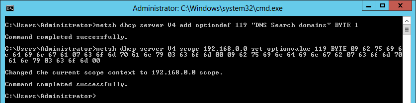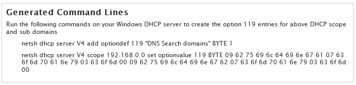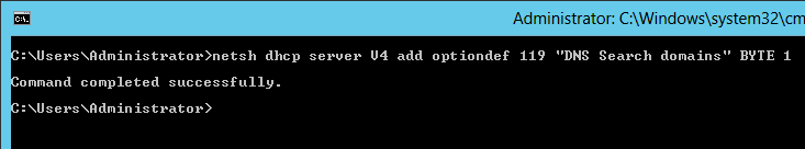 netsh dhcp server V4 add optiondef 119 "DNS Search domains" BYTE 1