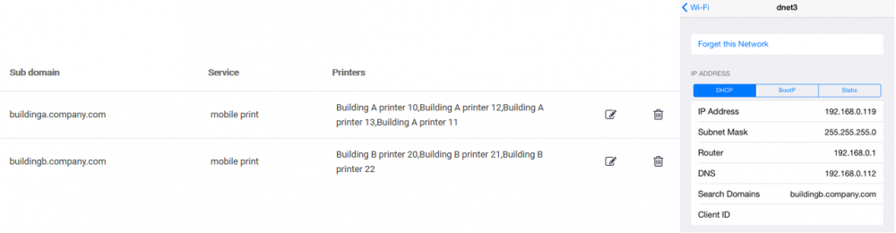 If multiple Wide area mobile print subdomains have been created, access to the subdomains on Apple iOS devices is given, by populating the “search domain” on the mobile device, with the search domain or domains that the particular device should have access to.