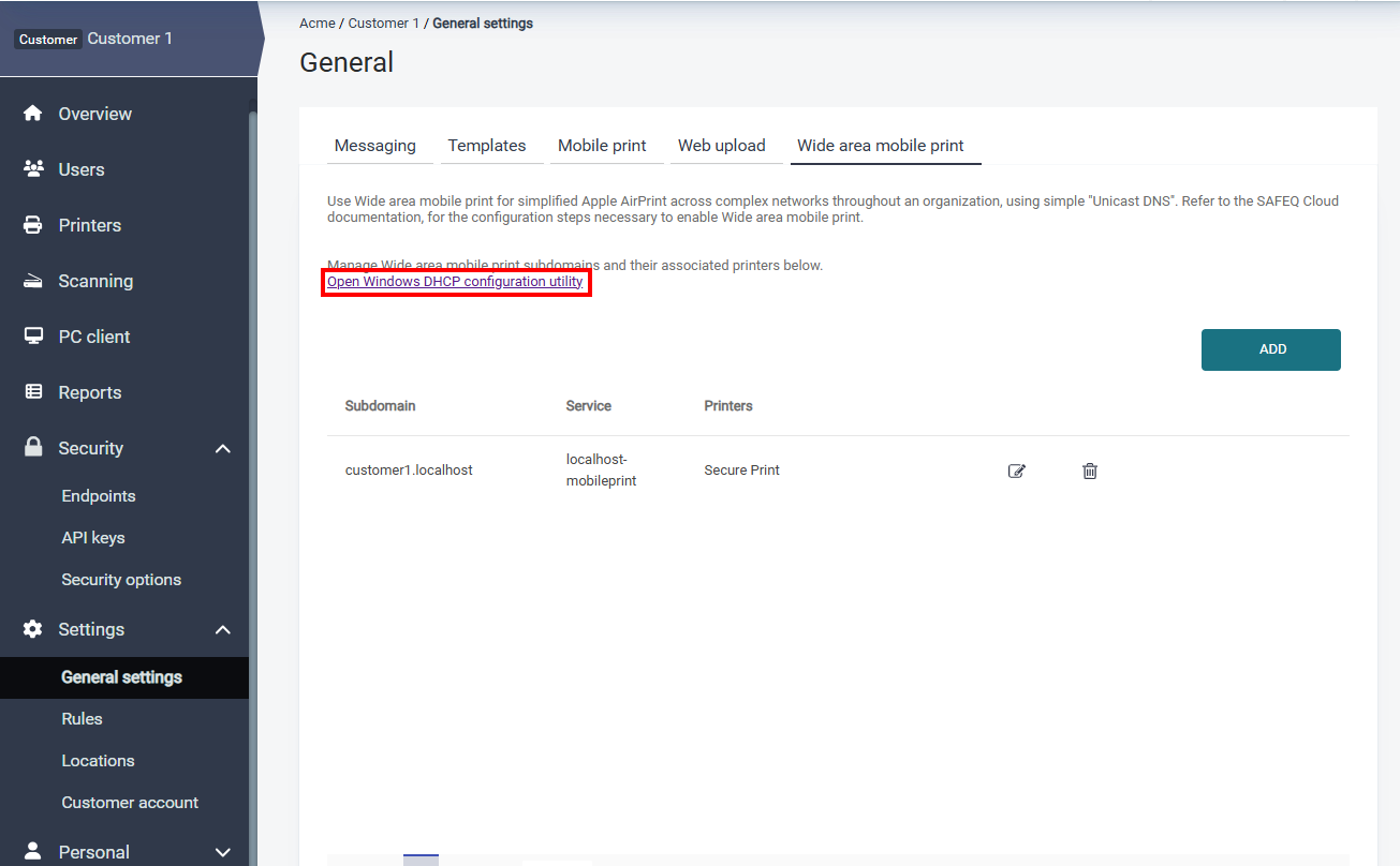- In the SAFEQ Cloud Administrator interface, go to Settings > General settings, tab Wide area mobile print and click the Windows DHCP Configuration Utility