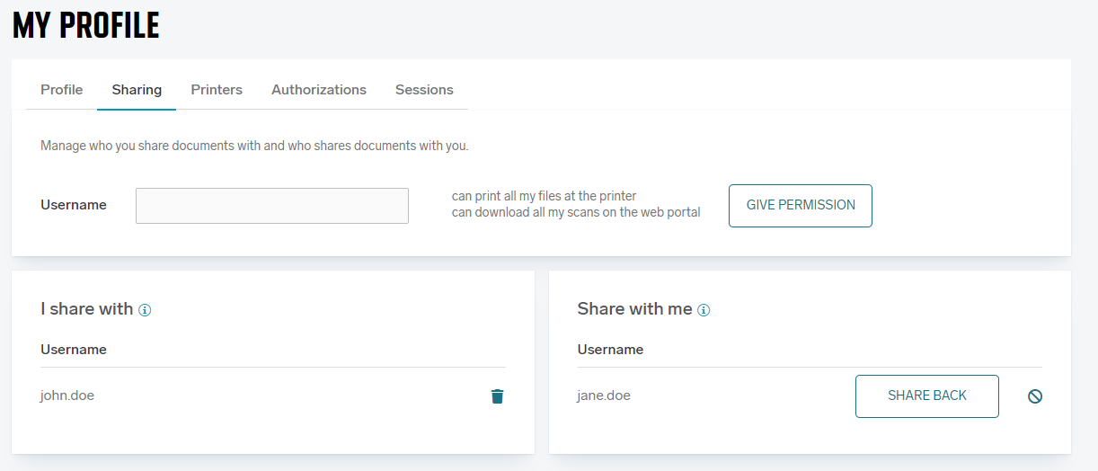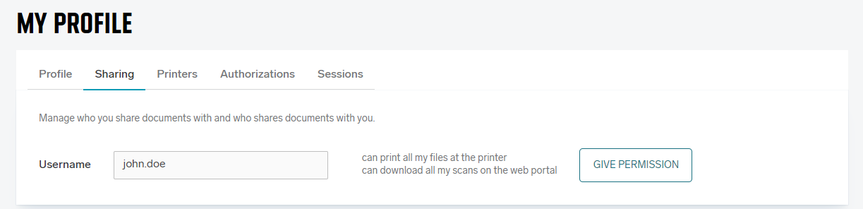 In the Sharing tab you can add sharing permission to other users, so they can see and print/download your documents/scans.