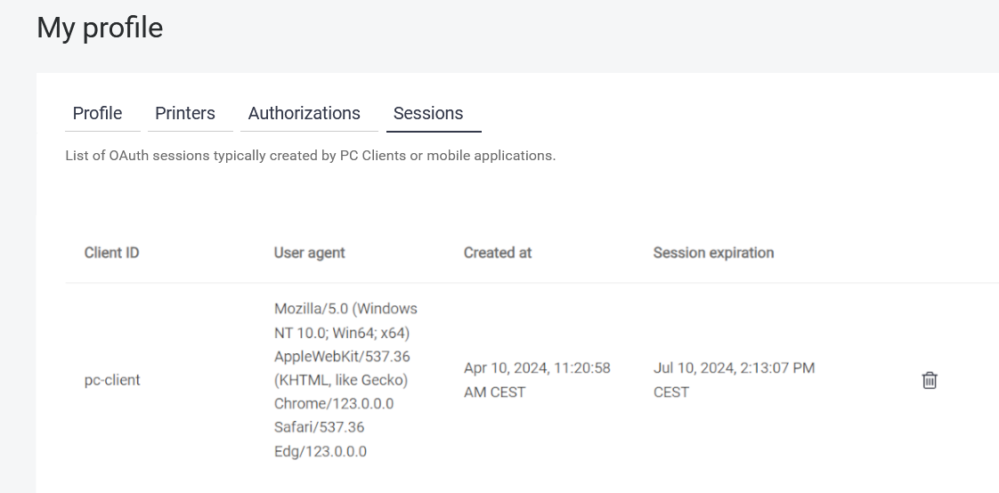 The Sessions tab shows your sessions created typically by logging in via the mobile application or SAFEQ Cloud Client. Each session contains information about the client ID, the user agent used for authentication, the date and time of session creation, and the session expiration. The expiration can be extended by refreshing a refresh token, typically done automatically by the clients.